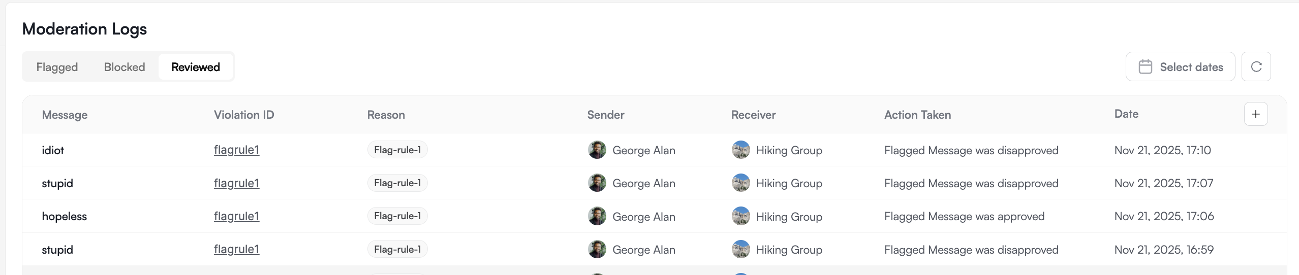 | Rule Triggered | Which moderation rule flagged/blocked the message |