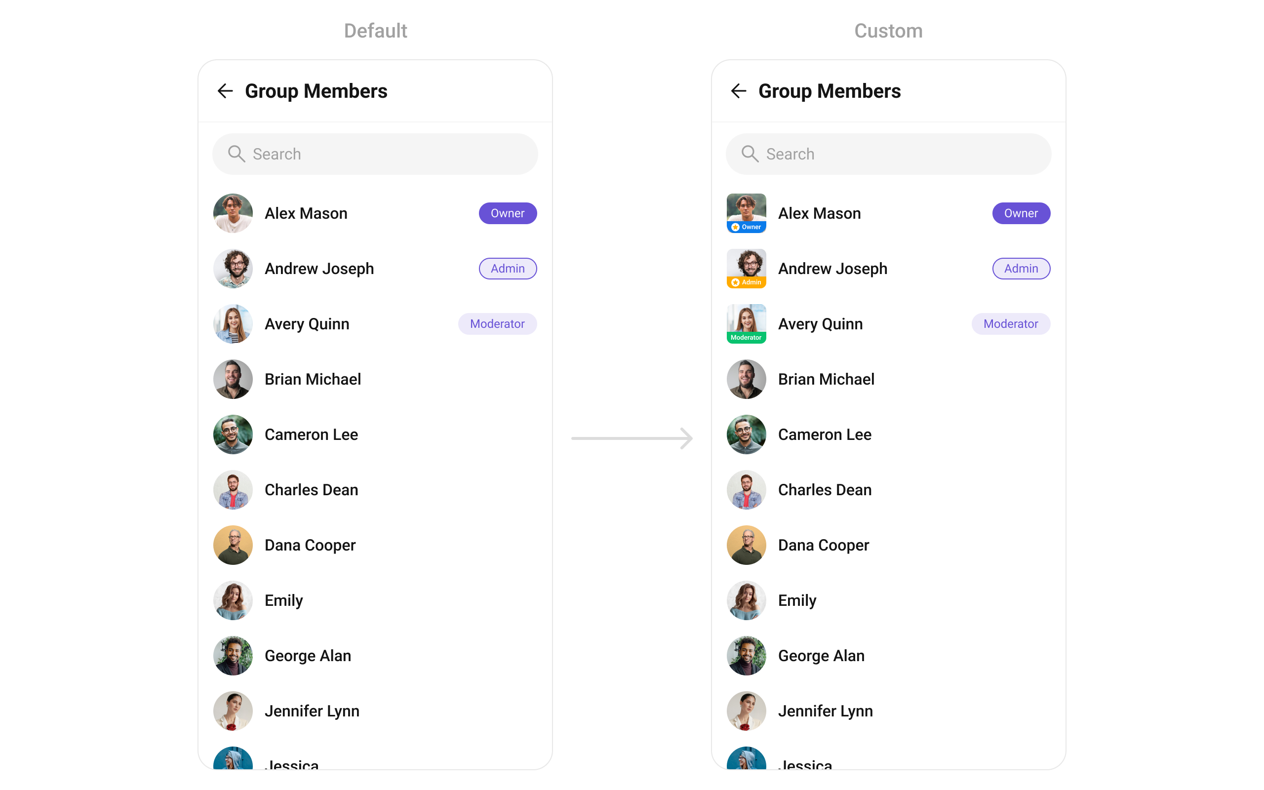 What this does: Defines a custom leading view layout with a CometChatAvatar and a role badge view that can display different backgrounds based on the member’s scope (admin, moderator, participant).