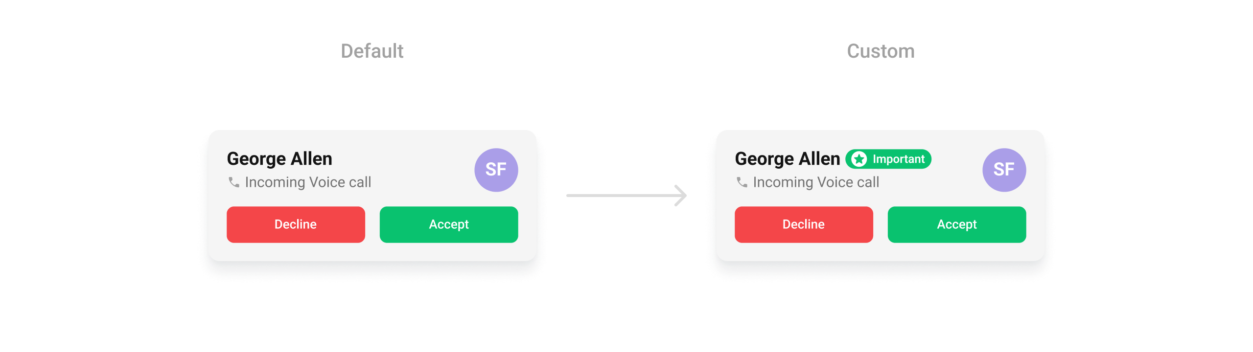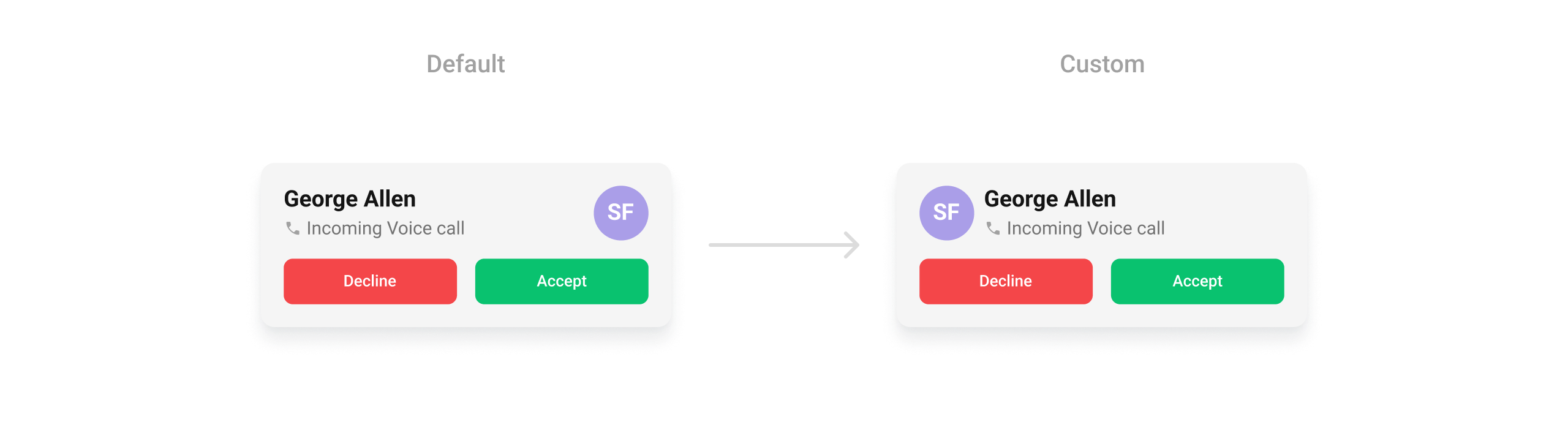 What this does: Replaces the entire default incoming call card with your custom View. The custom view is responsible for rendering all caller information and call controls.