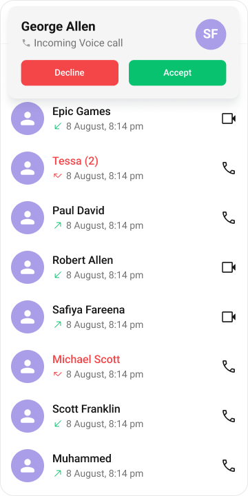 Call Logs component provides you with the records call events such as who called who, the time of the call, and the duration of the call. This information can be fetched from the CometChat server and displayed in a structured format for users to view their past call activities.