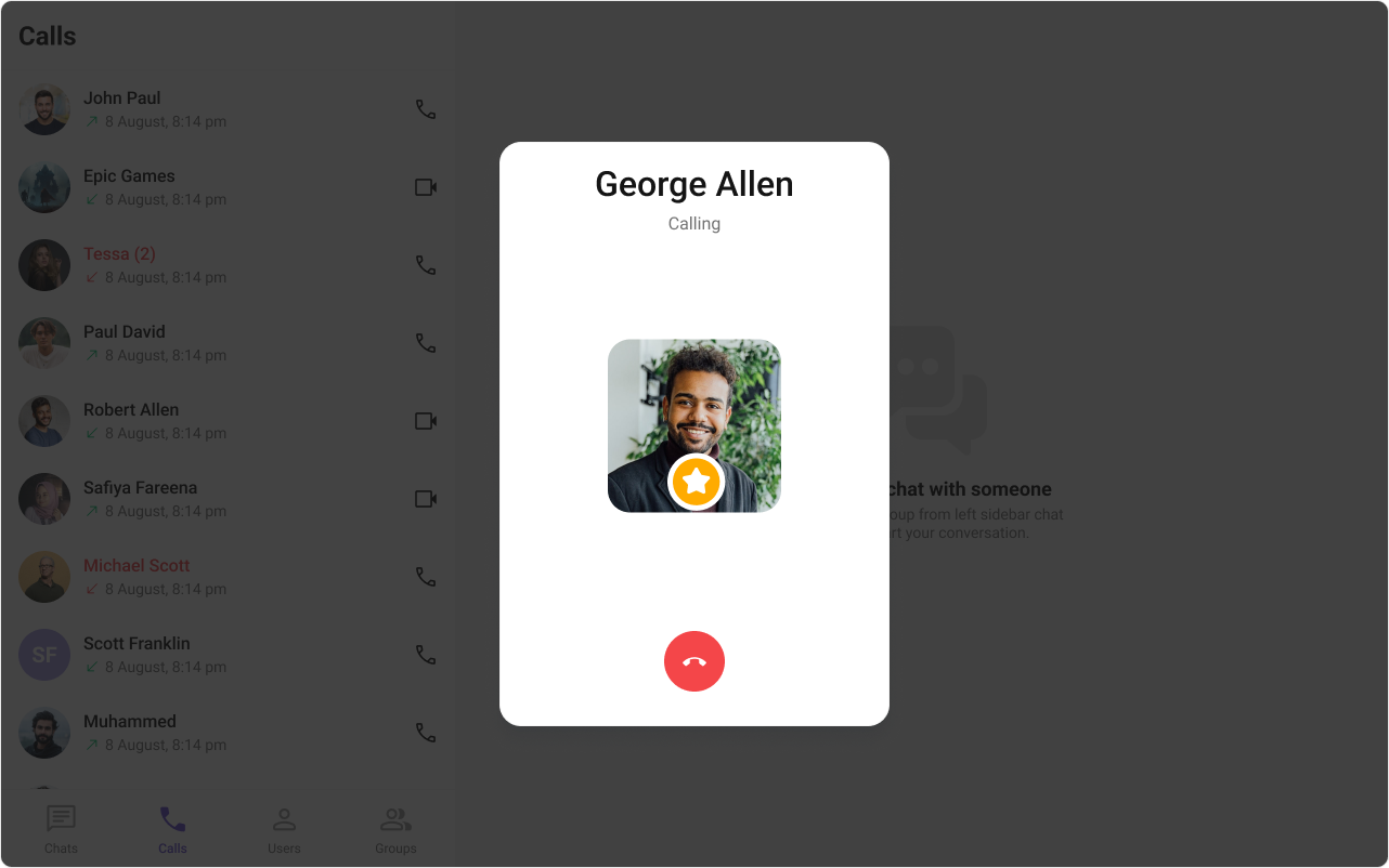 This prop renders the custom cancel-call button view for the outgoing call. Use this to override the existing cancel call button view from the outgoing call. The customized chat interface is displayed below.
