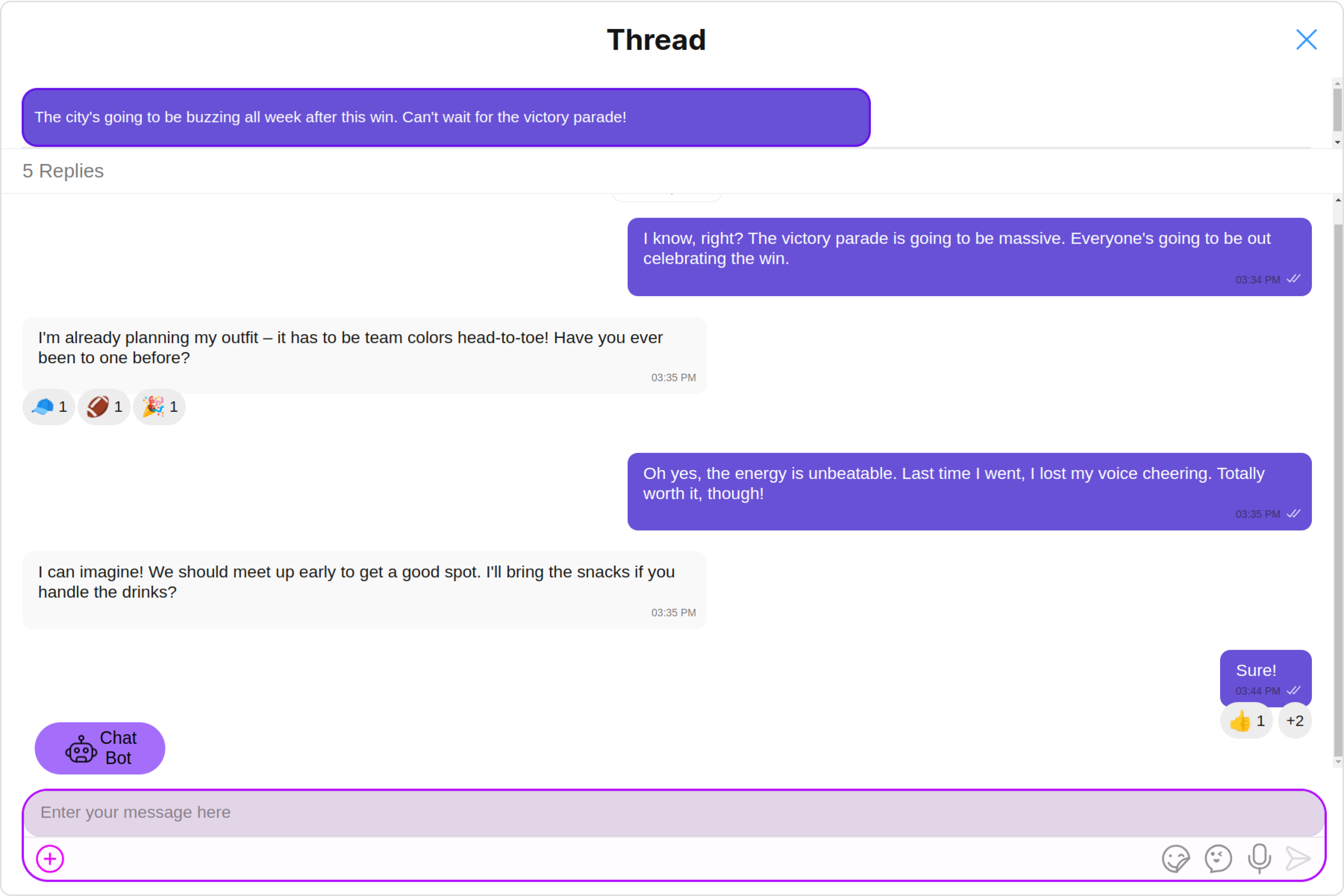 ThreadedMessages is a Composite Component that displays all replies made to a particular message in a conversation. By default, the parent message will be displayed at the top, the message composer will be at the bottom and between them a message list will contain all replies.